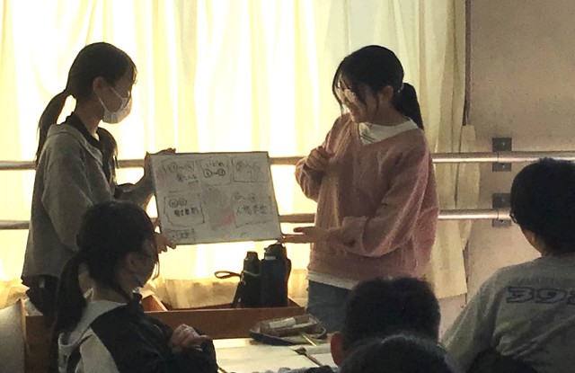 2年1組さん、なにやら4つのグループに分かれて、白熱した話し合いをしていました。