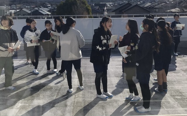 大きな声を出して練習するため、他のクラスに迷惑をかけないよう、外で練習だそうです。