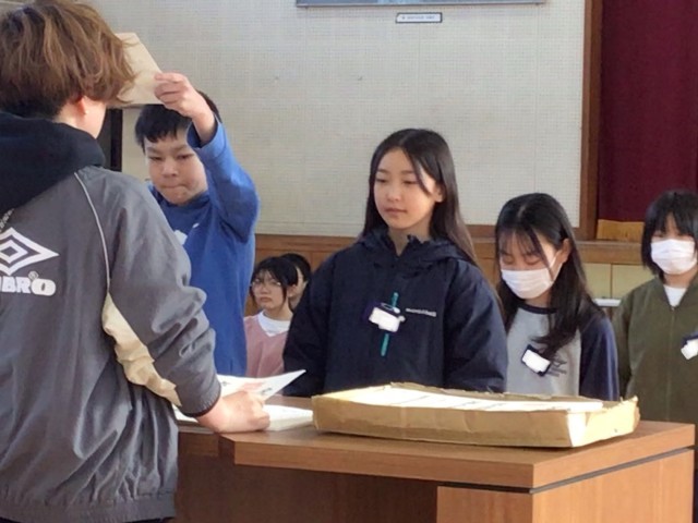 係の子たちが前に出て、先生からプリントをもらいますが、まだ何枚か余っています。
