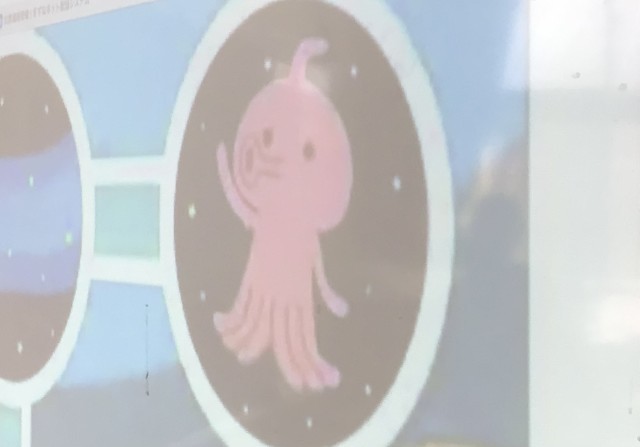 実は2枚目の写真(イラスト)を先生は宇宙人と説明したのですが、2組のみんなは「タコだ」と主張します。「校長先生はどう思いますか?」と聞かれたので、「宇宙人じゃないかな…」と答えたら、一番上の写真のような表情となりました。