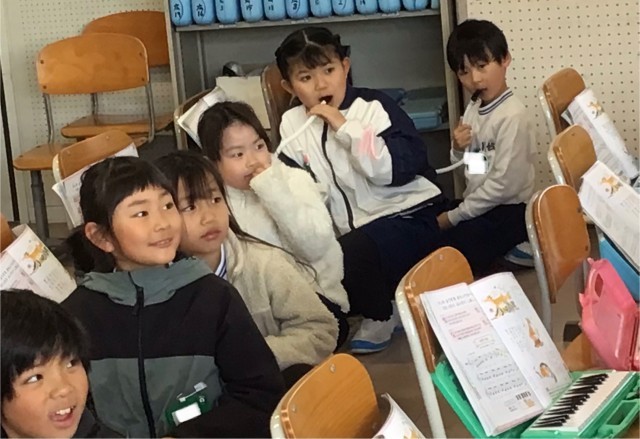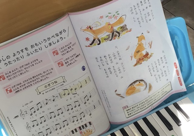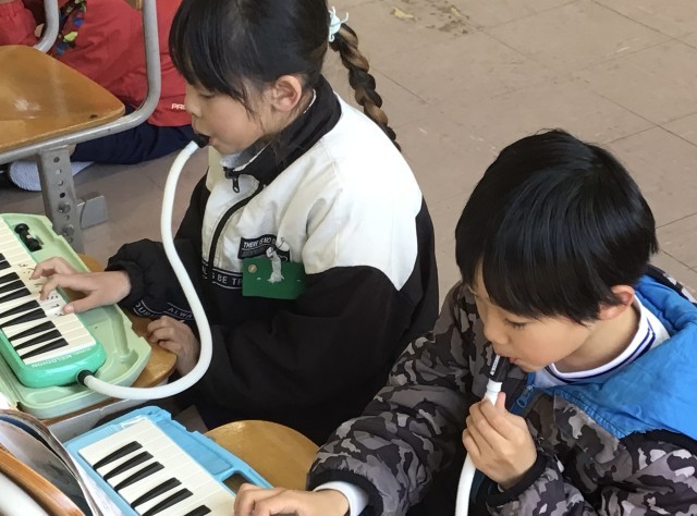 けんばんハーモニカで「こぎつね」を演奏中でした。