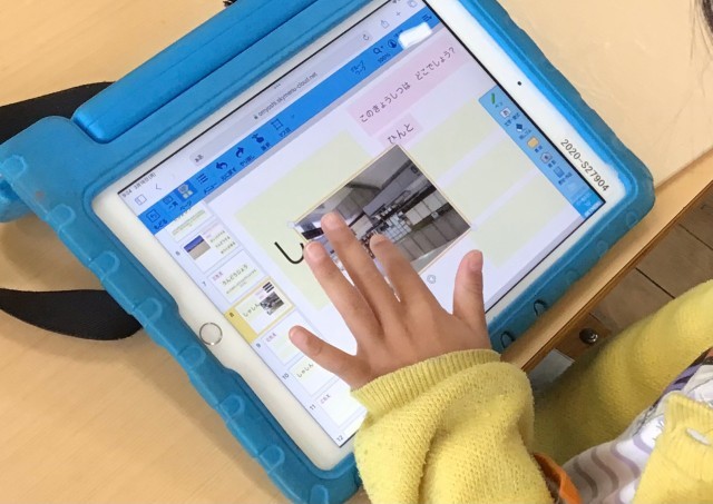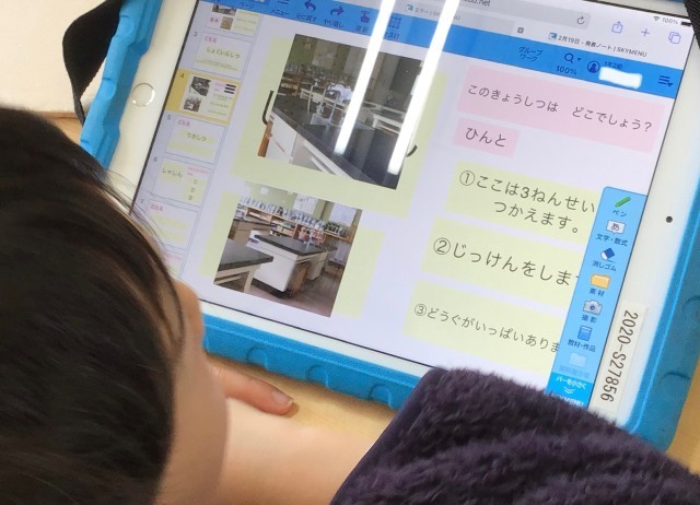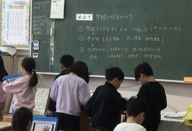 1年2組さん、学校クイズを作成中です。