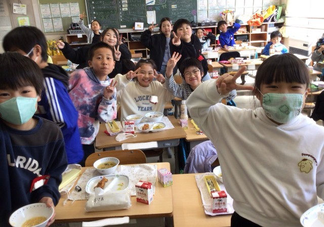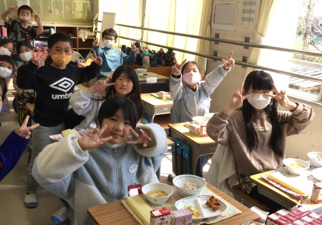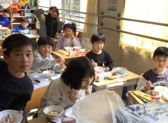 今日は卒業お祝い給食だったので、お赤飯、デザートのケーキまで出ました。
