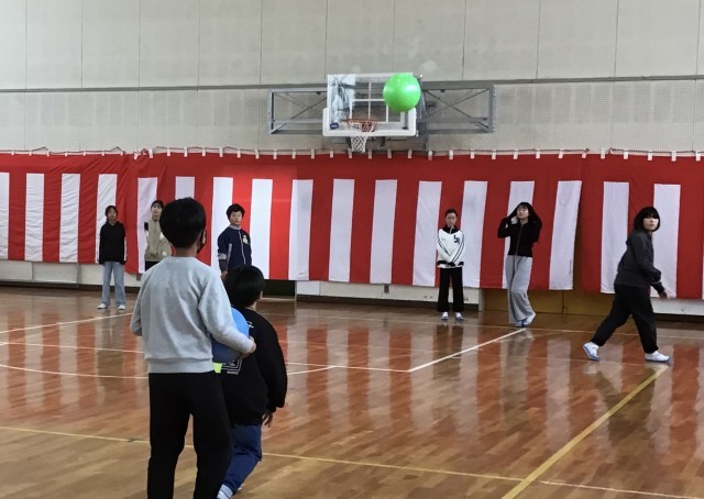 5年1組さん、ソフトミニバレーのボールを使って、男女混合のドッジボールです。