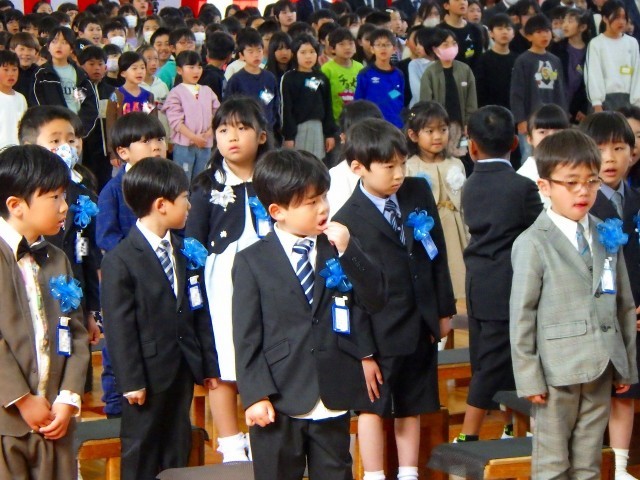 初めて聴く校歌をきょとんとした表情で受け止める1年生。