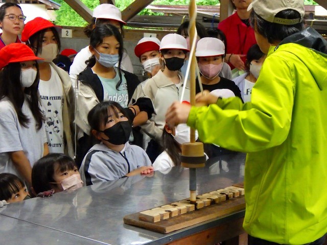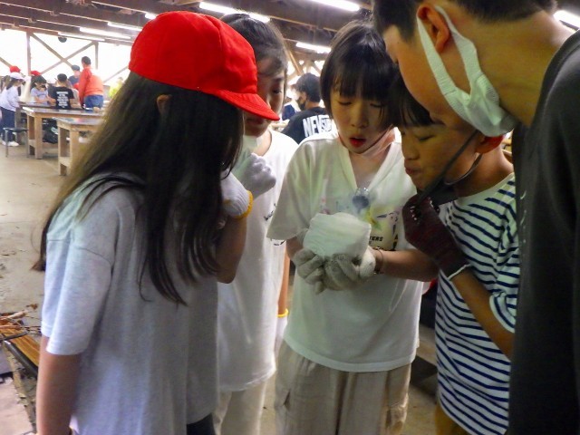 火起こし担当の子たち、所員の方の説明を食い入るように見ています。