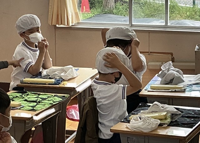 今日が初めての子たちは帽子のかぶるコツ「できるだけ髪の毛を帽子の中に入れます」「今回、給食当番じゃない子もやることを覚えます」と、先生に教えてもらっていました。