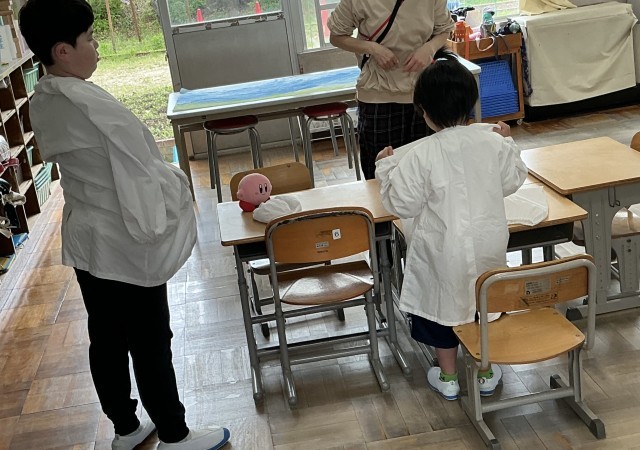 1年2組さん、白衣を着終わったので配膳を始めます。