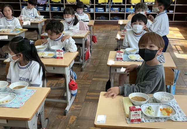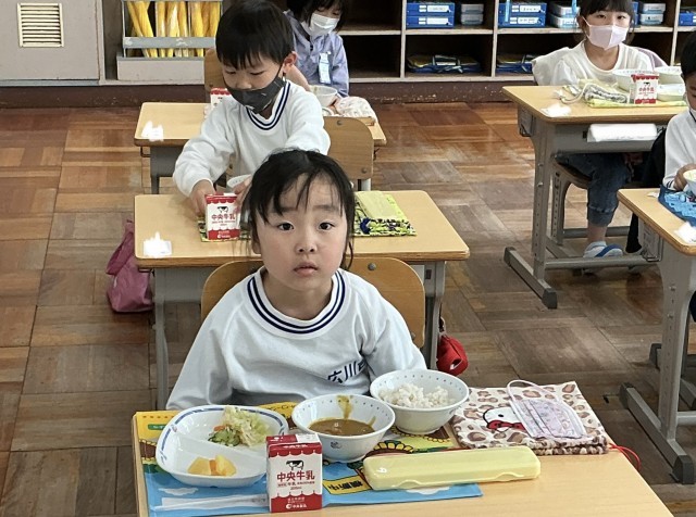 先生のお話が終わり、いよいよ給食です。