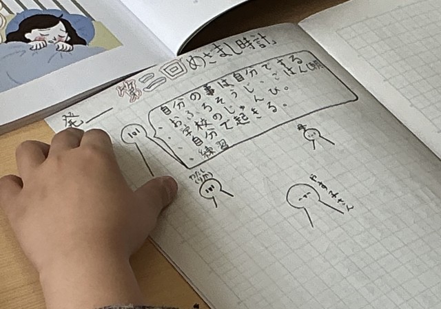 4年1組さん、第2回の道徳の授業で「目覚まし時計」というお話について考えていました。