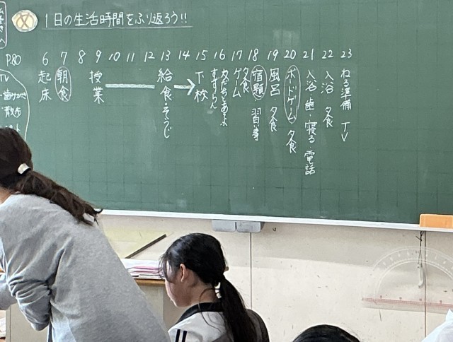 6年1組さん、家庭科の授業で自分の生活を振り返っていました。