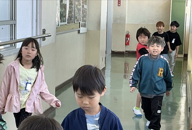 1年生の子たちが先生と一緒に校内を見学して回っていました。