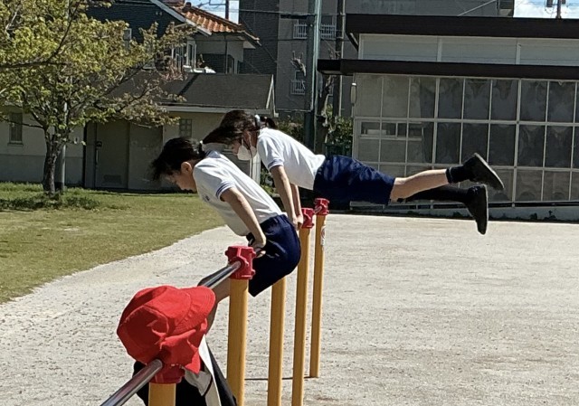 4年生の女の子は鉄棒のすごい技を見せてくれました。