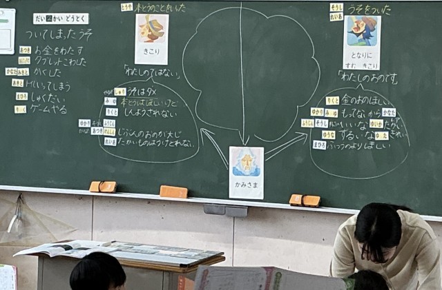 2年2組さん、道徳の授業で「金のおの」を通して、正直に生きることを考えていました。