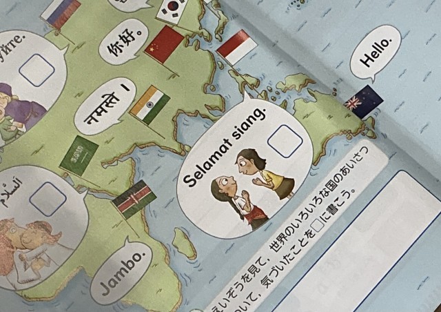 指さしている国がどこかを考え、その後、その国の「おはよう」について考えました。