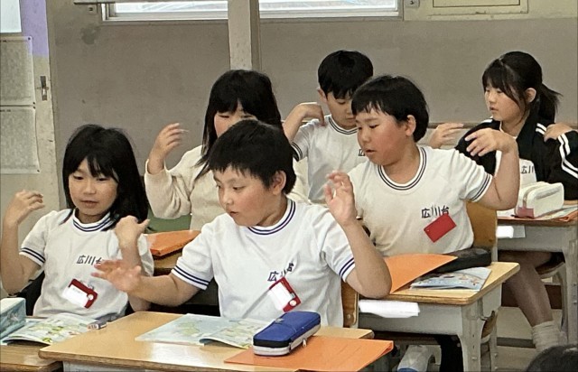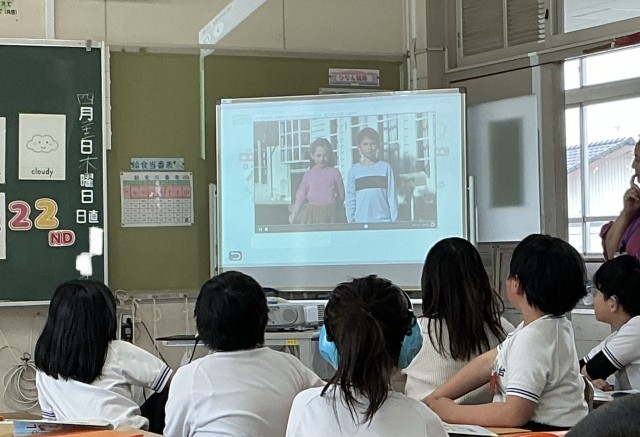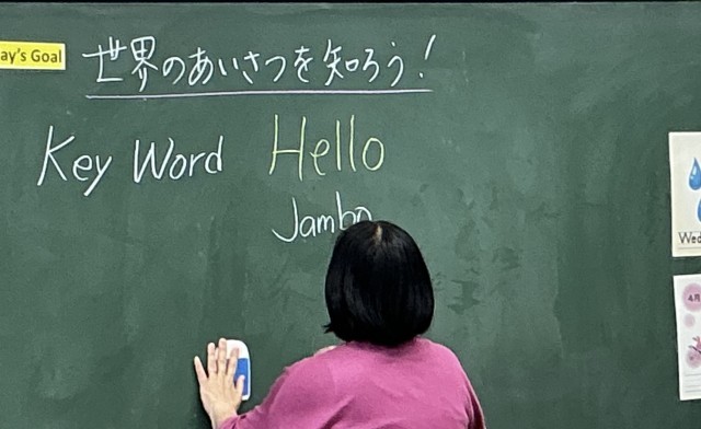 ハロー、アンニョハセヨ、ニーハオ、おはよう…など、ALT の先生が続けざまに話していくので、2人1組を作って、真ん中に置いた消しゴムを取り合うゲームです。
