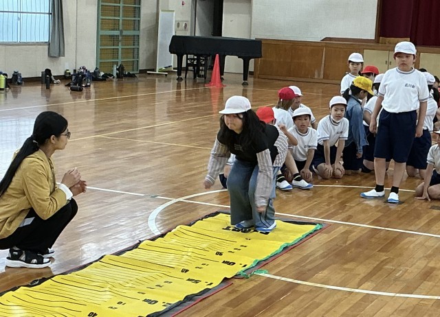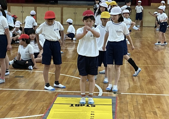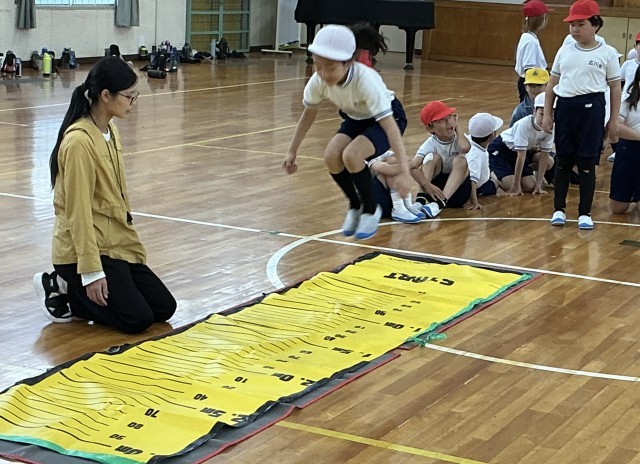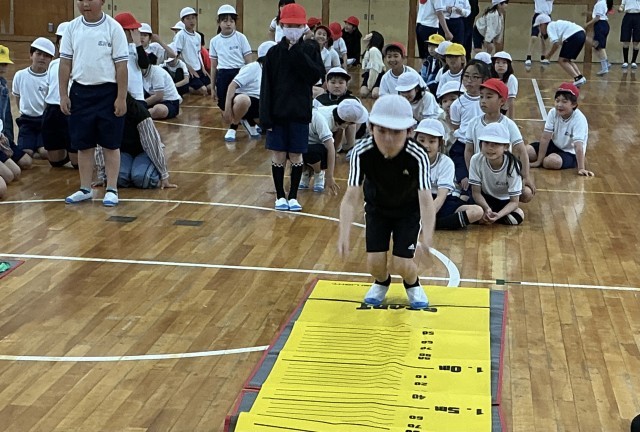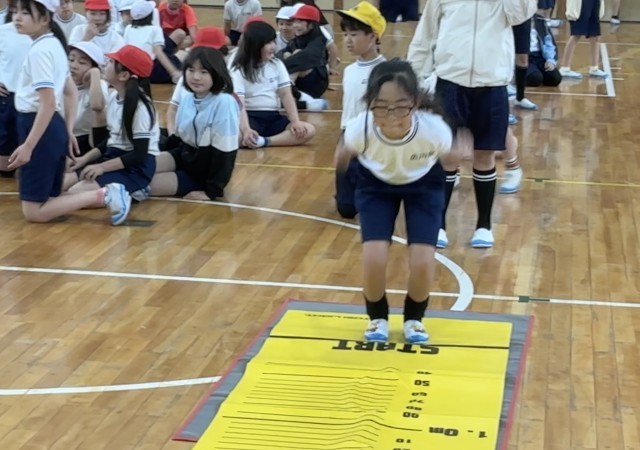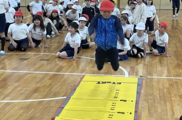 4年生のみんなが合同体育で立ち幅跳びの練習を体育館で行っていました。