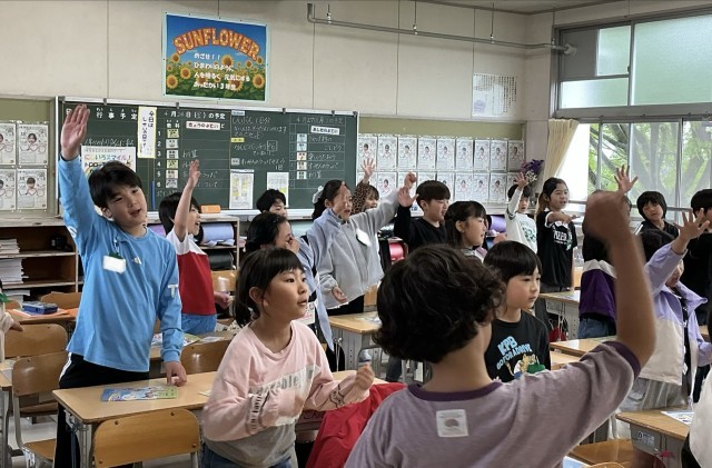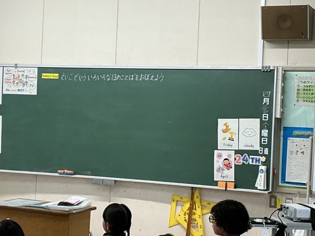 「元気よく」「英語は楽しまなきゃ」と先生に声を掛けられ、ノリノリで取り組む1組のみんなでした。