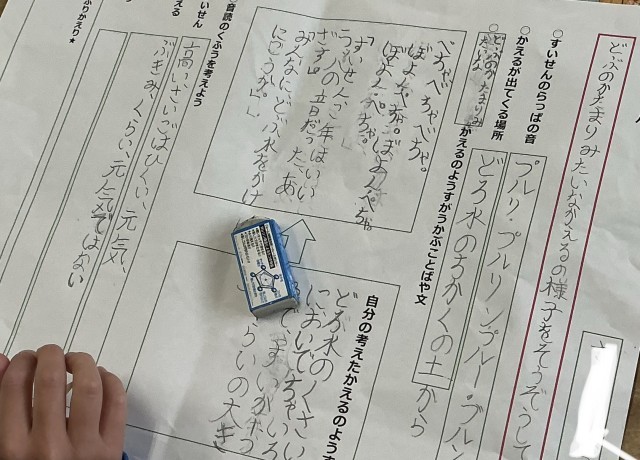 プリントにオリジナルかえるを書けたら、先生に見てもらいます。