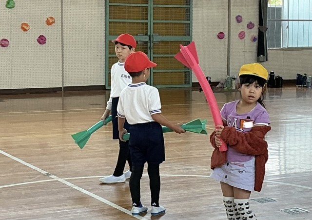 今日はロケットのような形をした軽い棒をまっすぐに投げる練習です。