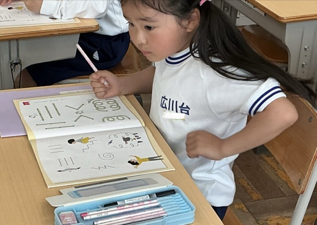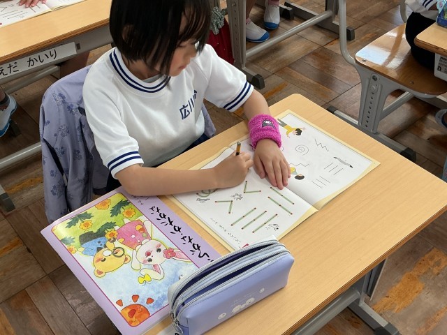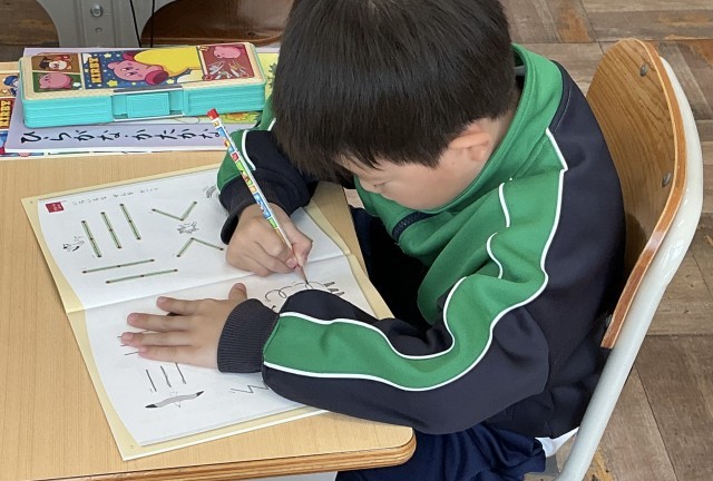 まずは書写たいそうをやって、せんなぞりをしていました。