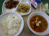 1月17日の給食は、ワンタンスープ、華風あえ、とり肉のから揚げ、ごはん、牛乳でし...