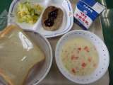 1月25日の給食は、ポタージュスープ、コーンサラダ、ハンバーグサンド(中濃ソース...