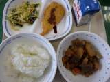 1月26日の給食は、筑前煮、アーモンドあえ、にぎすフライ、ごはん、牛乳でした。た...