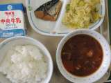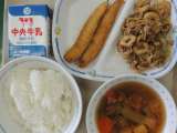 今日の給食は、ご飯、豚汁、たくあん和え、さばの煮つけ、牛乳でした。