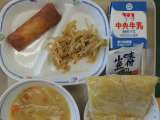 今日の給食は、中華麺、とんこつラーメンのスープ、ナムル、春巻き、乾燥小魚、牛乳で...