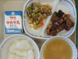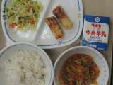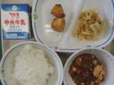 今日の給食は、ご飯、麻婆豆腐、大学いも、バンサンスー、牛乳でした。