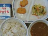 今日の給食は、麦ごはん、カレー、サワーキャベツ、チキンナゲット、牛乳でした。