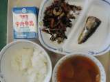 今日の給食は、ご飯、かしわじる、ひじきの煮つけ、さんまのおろしに、牛乳でした。
