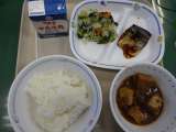 12月12日の給食は、根菜のみそ煮、ごはん、はくいの青菜あえ、さばのしょうが煮、...