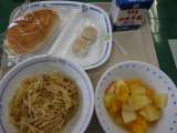 12月7日の給食は、ミートソースかけ、ソフトめん、フレンチサラダ、ウインナー、牛...