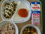 3月14日(木)の給食は、卒業祝い献立でした。赤飯、ふだま汁、骨太サラダ、レンコ...