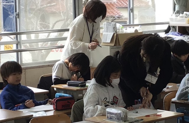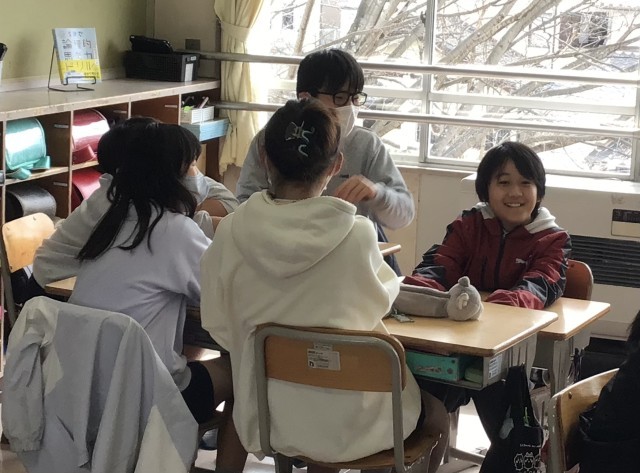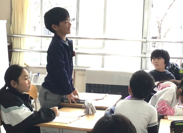 トロロ班の中で説明をする4年生のみんなです。