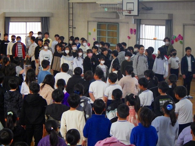 本日の全校集会では、先週金曜日に6年生のみんなが特別教室(音楽室、図書室、図工室、家庭科室など)を荷物を全て出して、掃除、ワックスがけをしてくれたので、そのお礼をしました。