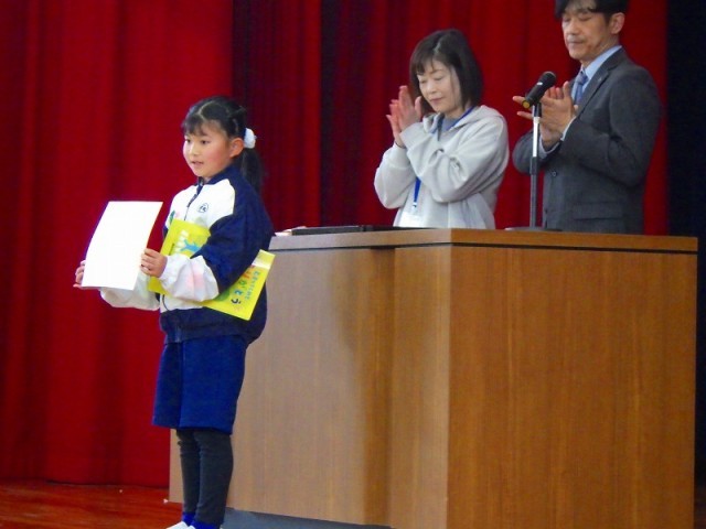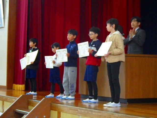 その後、全校集会スタートです。読書感想画では2年生の亜蓮くんが県の佳作に選ばれました。
