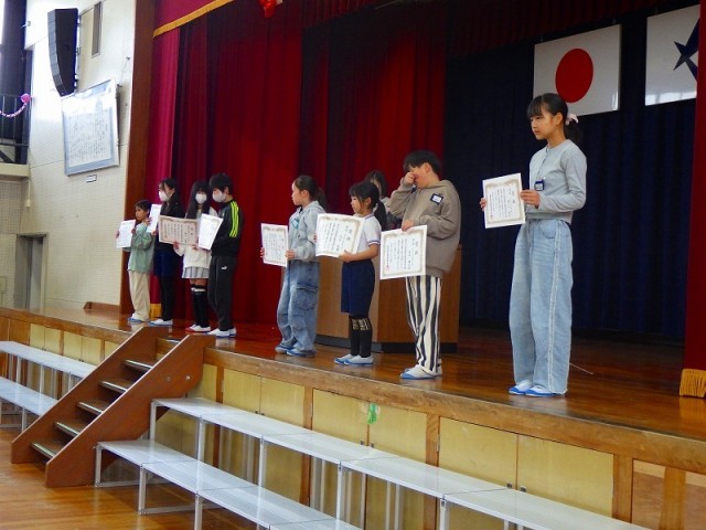 かきぞめコンクール、交通安全ポスター、書き初め展の表彰を行いました。