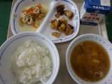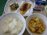 4月19日の給食は、豚汁、ごまあえ、いわしのしょうが煮、ごはん、牛乳でした。いわ...