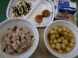 4月21日の給食は、ふだま汁、赤飯、ひじきサラダ、ごまつくね、マヨネーズ風ドレッ...