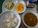 4月23日の給食は、カレーライス、チキンサラダ、ミックスフルーツ、麦ごはん、牛乳...