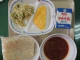 今日の給食は、豊田めん、ミートソースかけ、ツナサラダ、チーズオムレツ、牛乳でした...