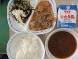 今日の給食は、ご飯、味噌汁、骨太サラダ、豚肉のしょうが炒め、牛乳でした。