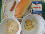 今日の給食は、ミルクロール、マカロニのクリーム煮、コールスローサラダ、ウインナー...