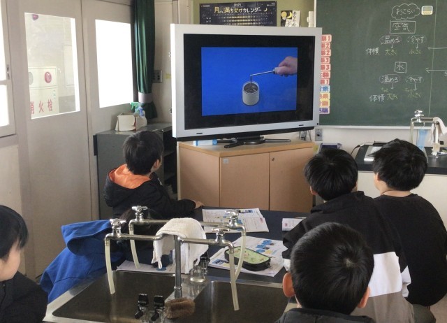 4年2組さん、理科の実験です。今まで空気や水を温めたり、冷やしたりすると体積...