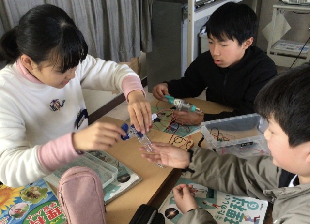 5年2組さん、電磁石の勉強をし、なにやら部品を組み立てて、フットサルロボを作...