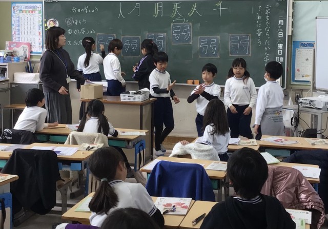 2年1組さん、書写の授業で書き順の確認大会を行っていました。見に行った時は「弱...