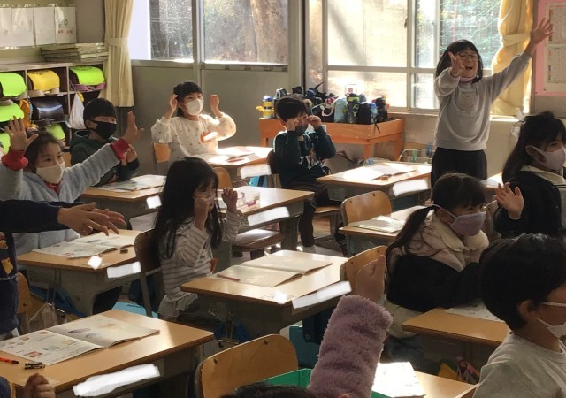 1年2組さん、音楽の授業です。写真は「おちゃらか ほい」を先生と楽しんでいる様...